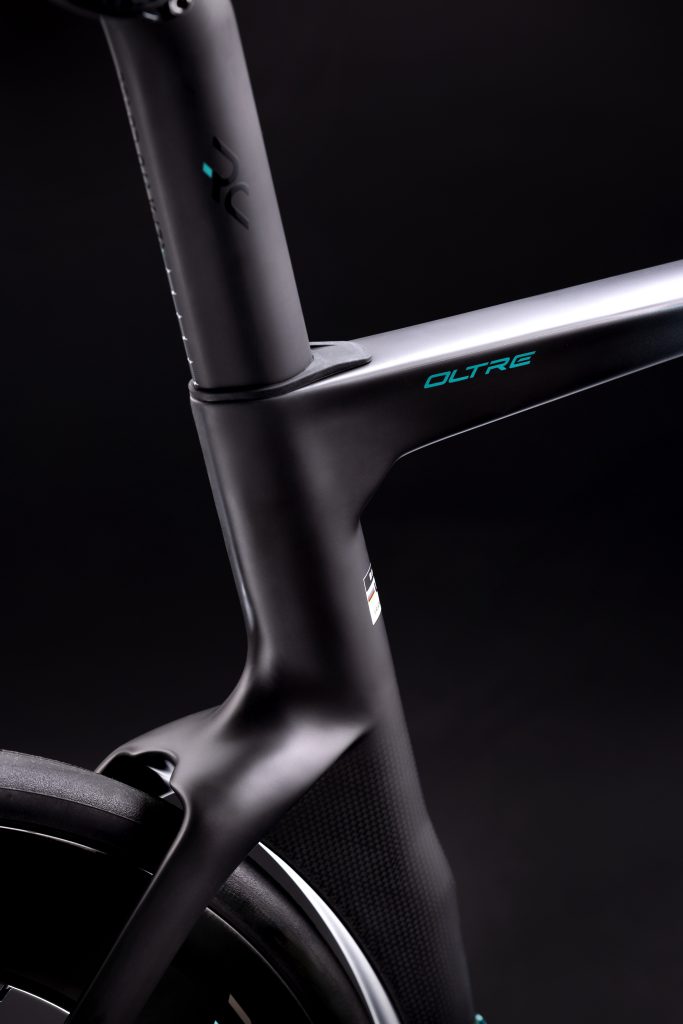 The second, black, colourway (ZW code) is a futuristic interpretation combining black, exposed raw carbon fibre with the aforementioned metallic celeste. The high-tech appearance mirrors the advanced performance features of the Oltre RC, with the naked constructive material serving to take the viewer into the frame. The reduced paint on the frame also serves to lighten the overall weight (60 gr +/- 5% less than the celeste version).