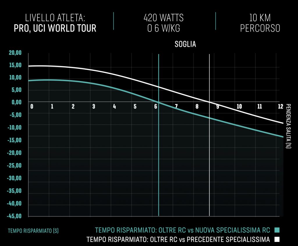 Il Reparto Corse è riuscito nell’obiettivo, spostando i parametri di pendenza e potenza a partire dai quali Specialissima garantisce un vantaggio rispetto a una bici prettamente aero.