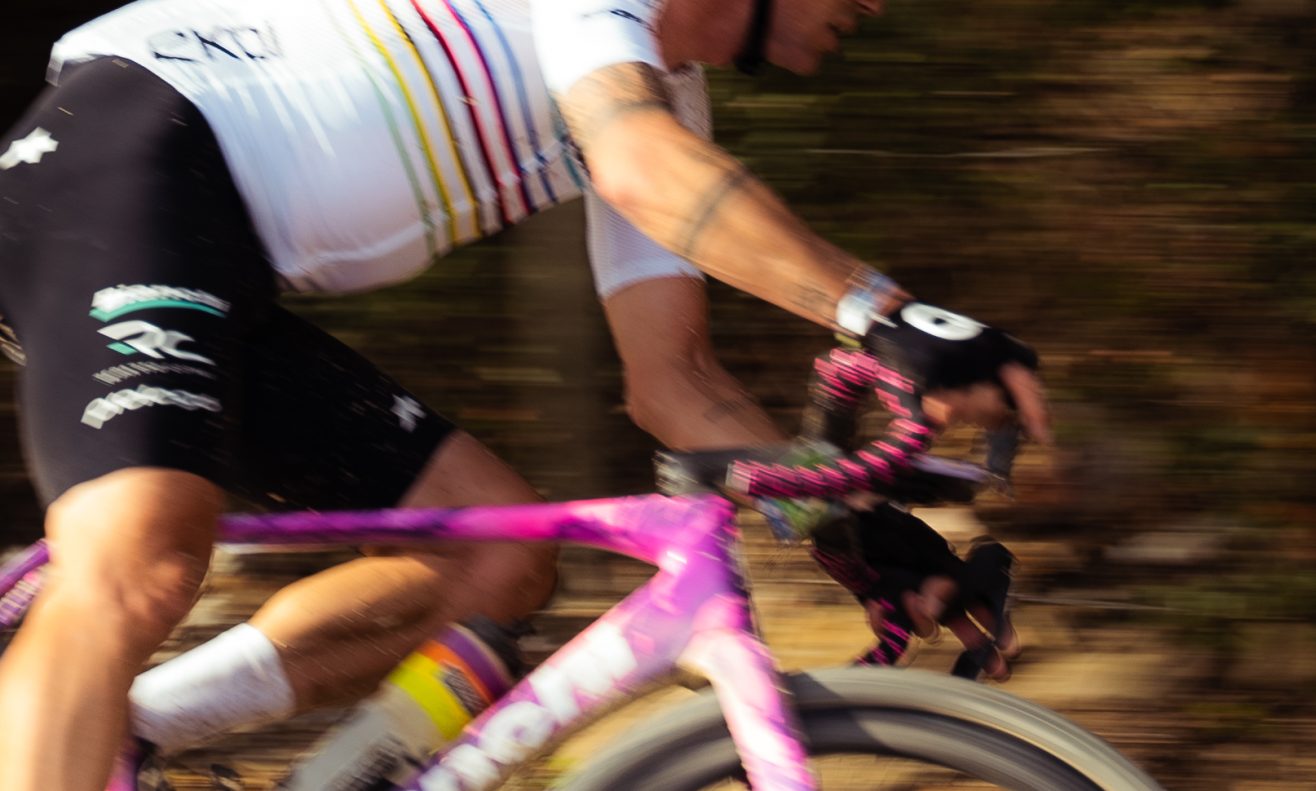 Roche claimed his first victory wearing the rainbow jersey of Gravel World Champion with his Impulso RC, in the exclusive Miami Drip version from the Officina Bianchi customization program.