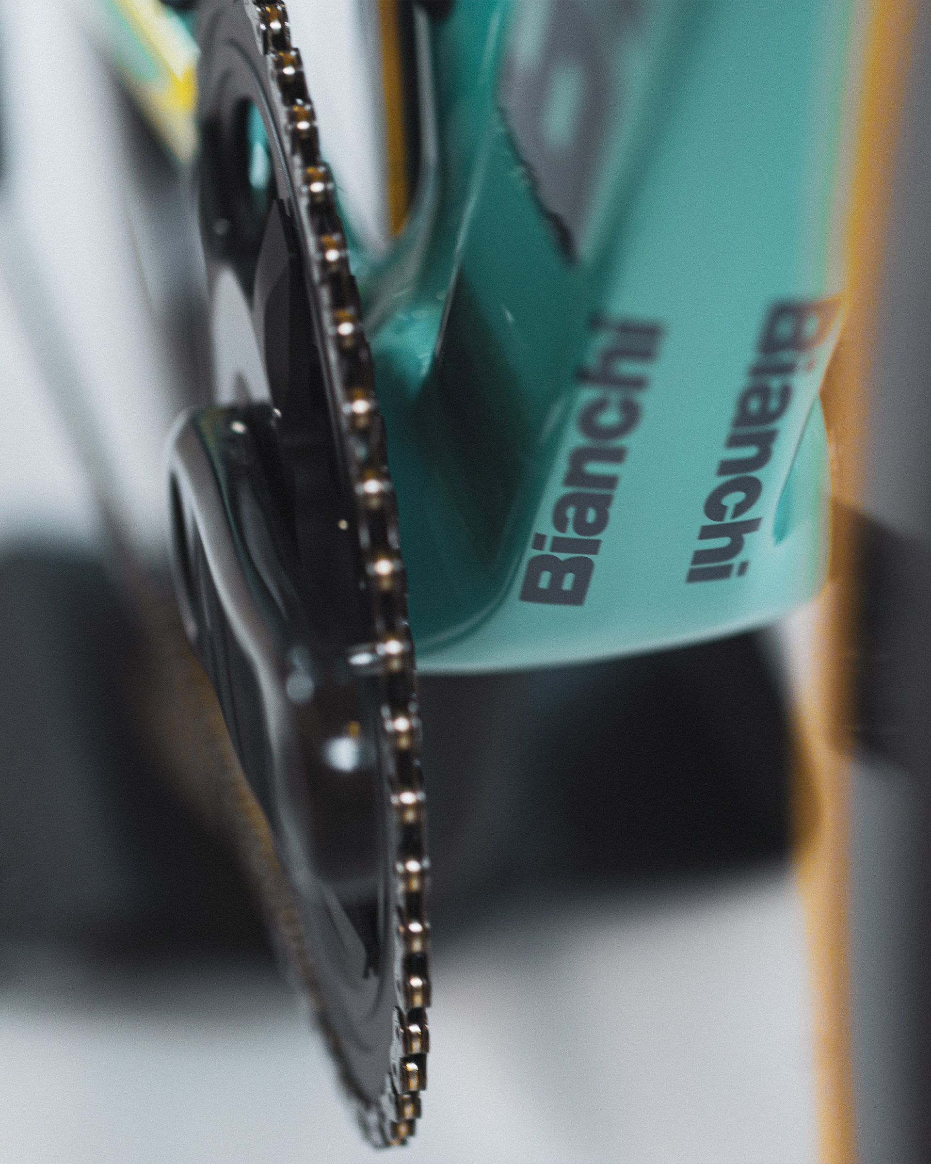 At the head tube, the original Bianchi eagle emblem, painstakingly reproduced by Bianchi’s team of designers, and faithfully modelled on the archival designs of the era of Pantani’s dominance.